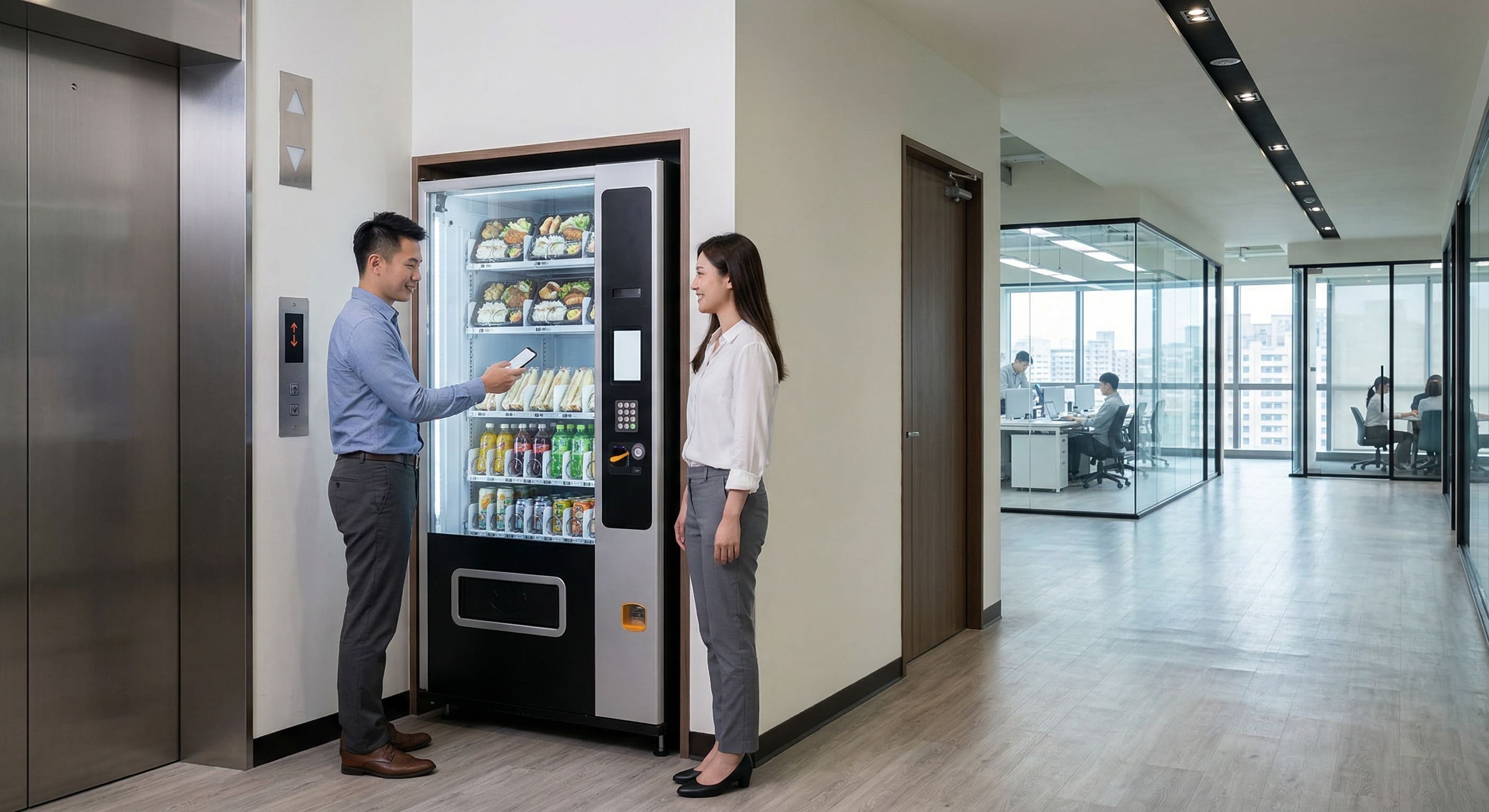 物業管理委員會在各樓層的公共梯廳導入了公司熱食販賣機矩陣後,局勢徹底翻轉。物流車隊統一在上午十一點前透過貨梯將餐點批量配送至各樓層機台。中午十二點,大樓員工只需步出辦公室大門,走到梯廳掃碼,五秒內即可取得熱食。大廳瞬間恢復了原有的寧靜與寬敞,物業保全得以專注於來訪貴賓的門禁管理。這項硬體設施的進駐,實質提升了該大樓對承租企業的附加價值,成為招商時的一大亮點。
