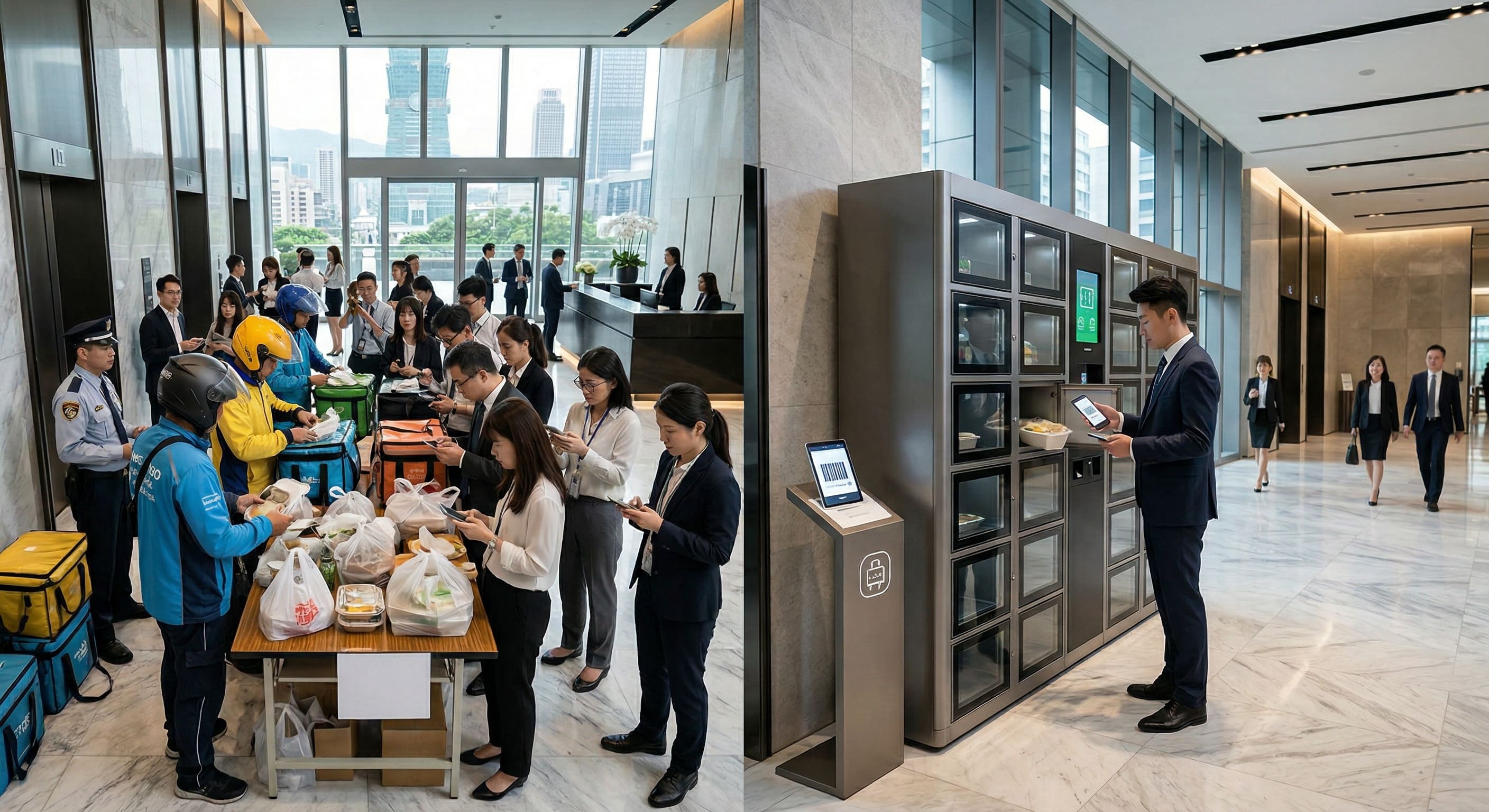 在台北信義區、敦南商圈或內湖科學園區的 A 級商辦大樓中,維持頂級的企業門面與專業形象,始終是物業管理的首要課題。然而每當正午時分,大廳往往瞬間淪為混亂的集散地:外送機車隨意停放、外送員提著大包小包頻繁進出、員工在大廳焦急等候並反覆核對電話號碼。這種碎片化且低效的辦公大樓午餐外送現象,不僅造成電梯嚴重超載,更深刻破壞了商務環境應有的肅靜與秩序感。